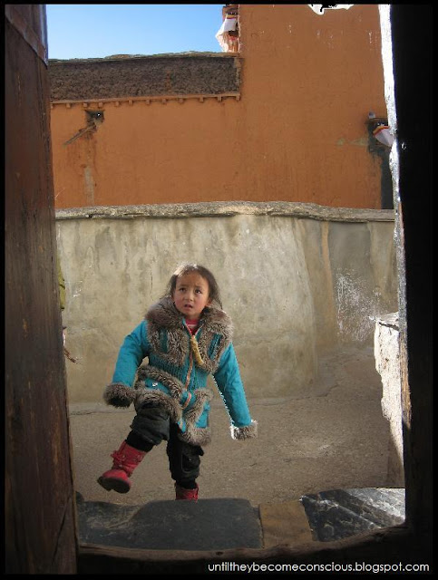 | A TIBETAN girl peers into the dark at the terrifying faces of the '100,000 images' - the largest chorten in Tibet (Gyantse, Tibet, 2009) Photo by Joe Briscoe. |